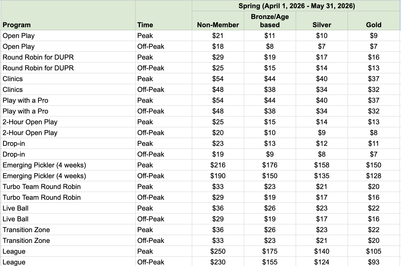 The new pricing structure will be in effect from April 1 – May 31. Court reservations booked prior to April 1 will not reflect these new prices.